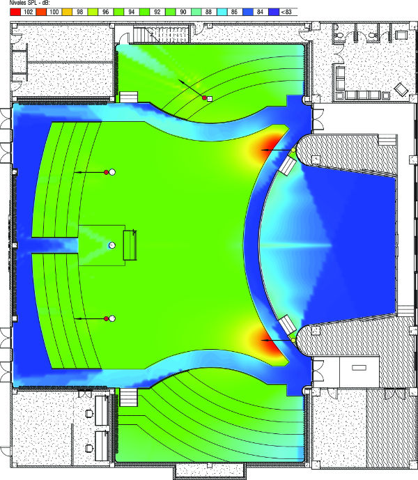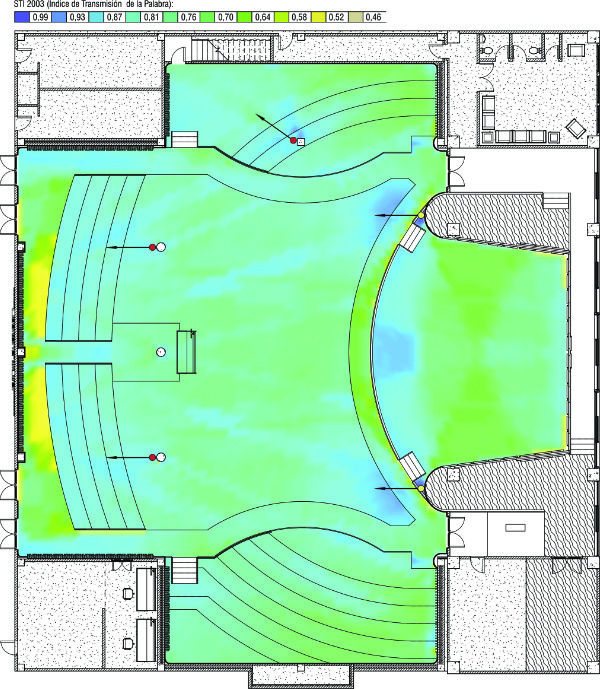 Distribución de la energía sonora en el recinto, con diferencias mínimas en gradería. Clasificación STI, en parámetros de Excelente, con un promedio de 0,8 a 0,9. (Imagen superior)